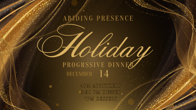 Join us for an evening filled with food, fellowship, and festive cheer at the Abiding Presence Holiday Progressive Dinner! We'll gather at 4:00 PM for appetizers at our first...